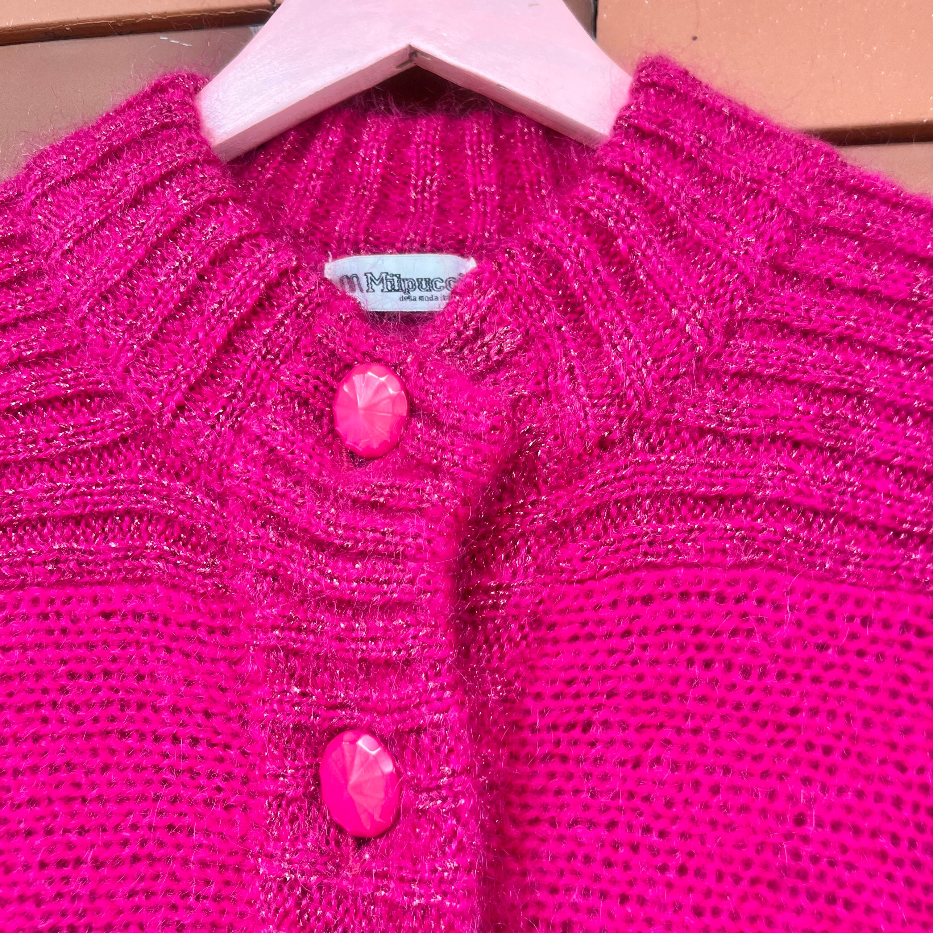 ピンクの糸の中に細かくラメ糸がはいっていてきらきらします。飴玉のようなボタンも可愛い。