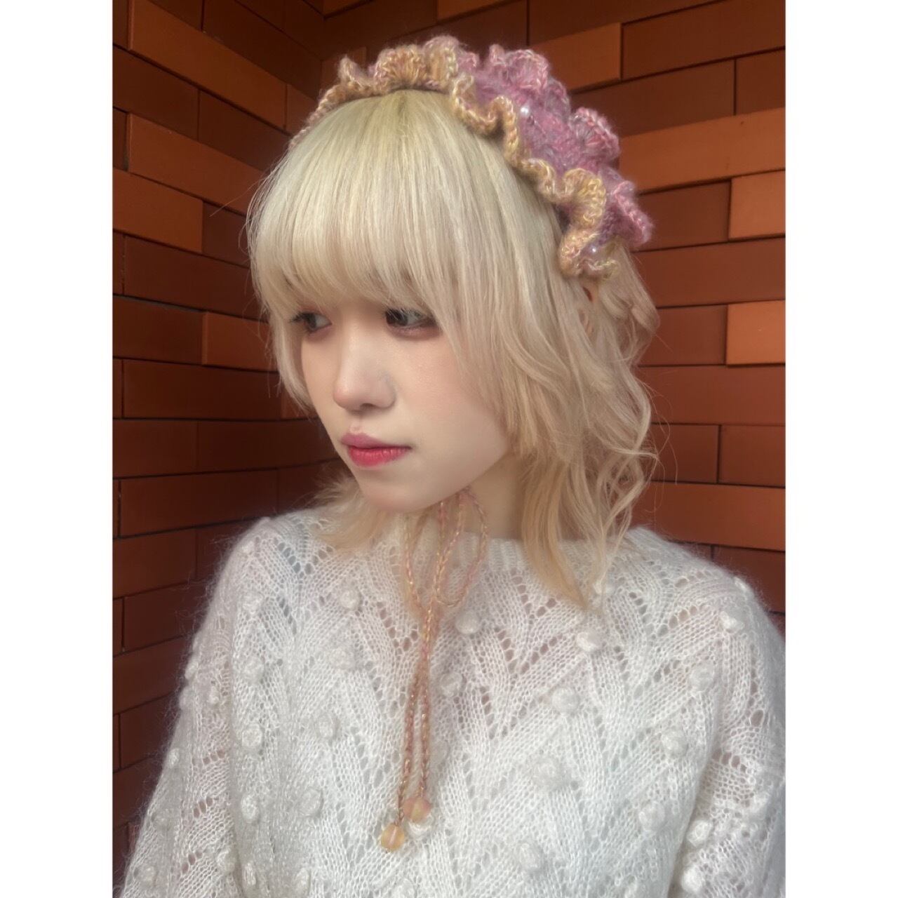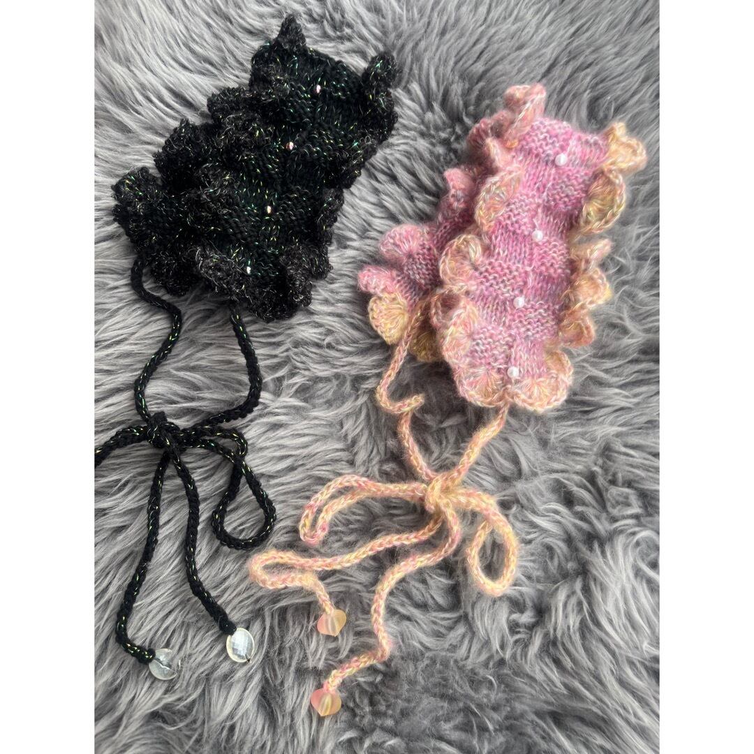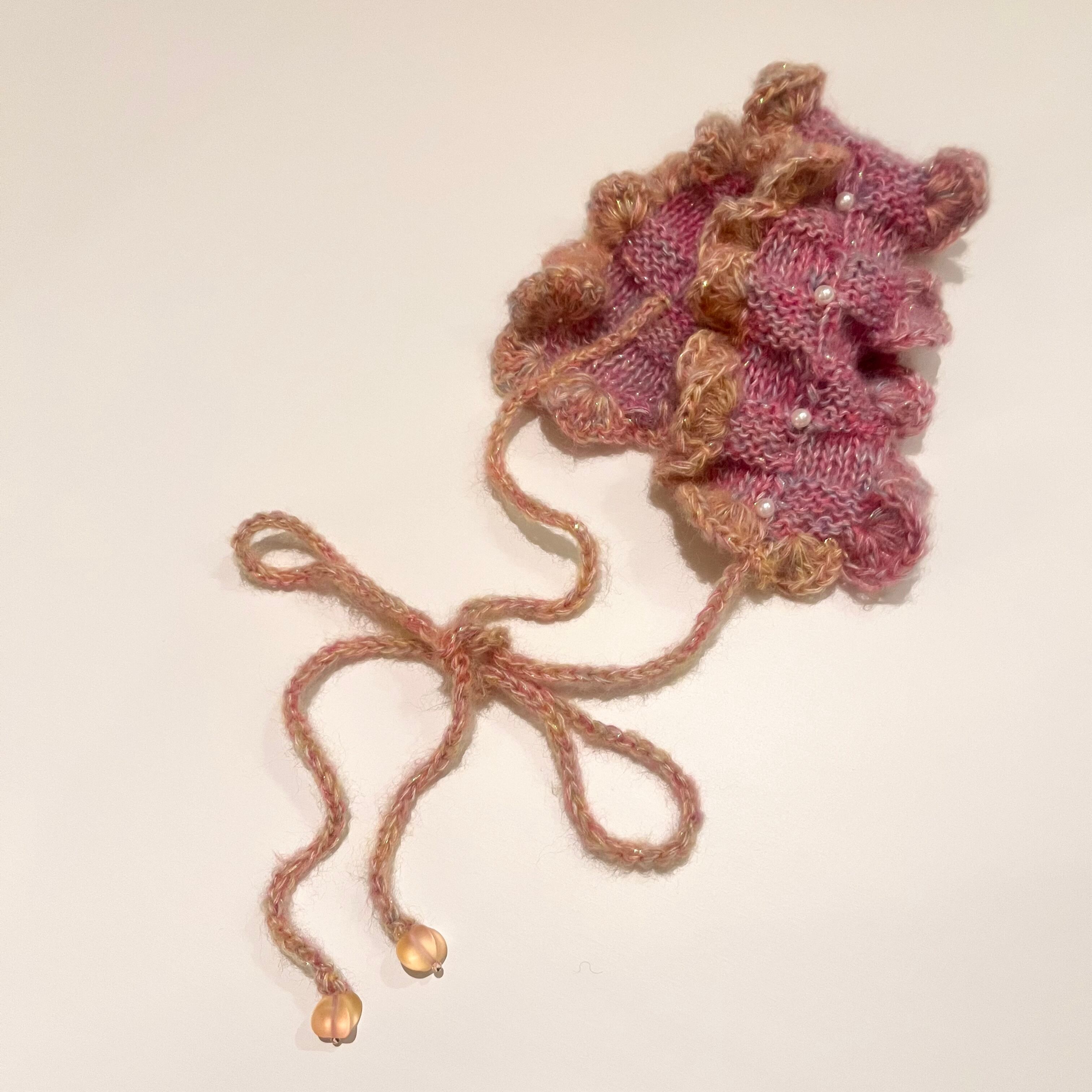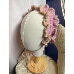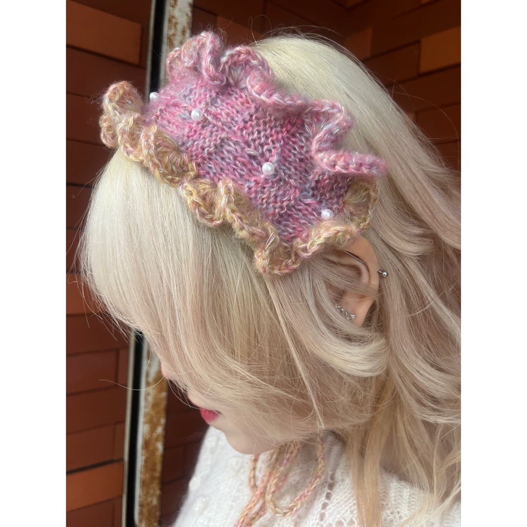 she soオリジナル手編みのニットヘッドバンドの新作。ピンクのグラデーションで両サイドのフリルのお色が異なります
